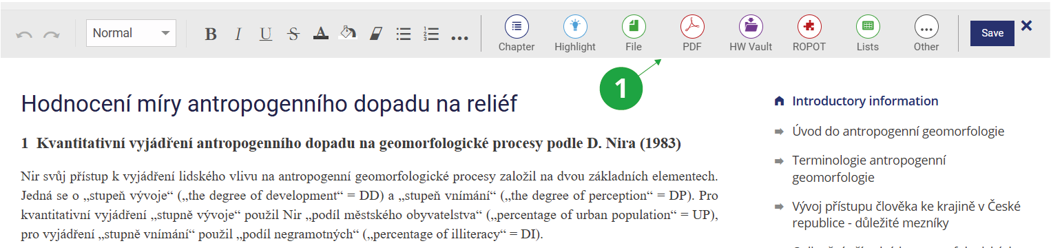 Editing the interactive syllabus is called WYSIWYG (acronym for the English sentence "What you see is what you get"). If you use prepared elements and do not embed advanced scripts in HTML code, for example, you will see the syllabus content as students will see it. If you want to test how the outline looks in real view without editing elements during editing, use the “Normal View” option in the outline operations menu. Use the “View All” option (in the normal view) to view the outline of the interactive syllabus, including the locked chapters (eg to check the outline of the interactive syllabus after editing). However, such an outline can only be seen by a person with sufficient rights, not by the student. To print the interactive syllabus, select “View All” (in normal view) and then print the outline using the “Print” option in your browser.1 Setting the recommended interval for chapter study.