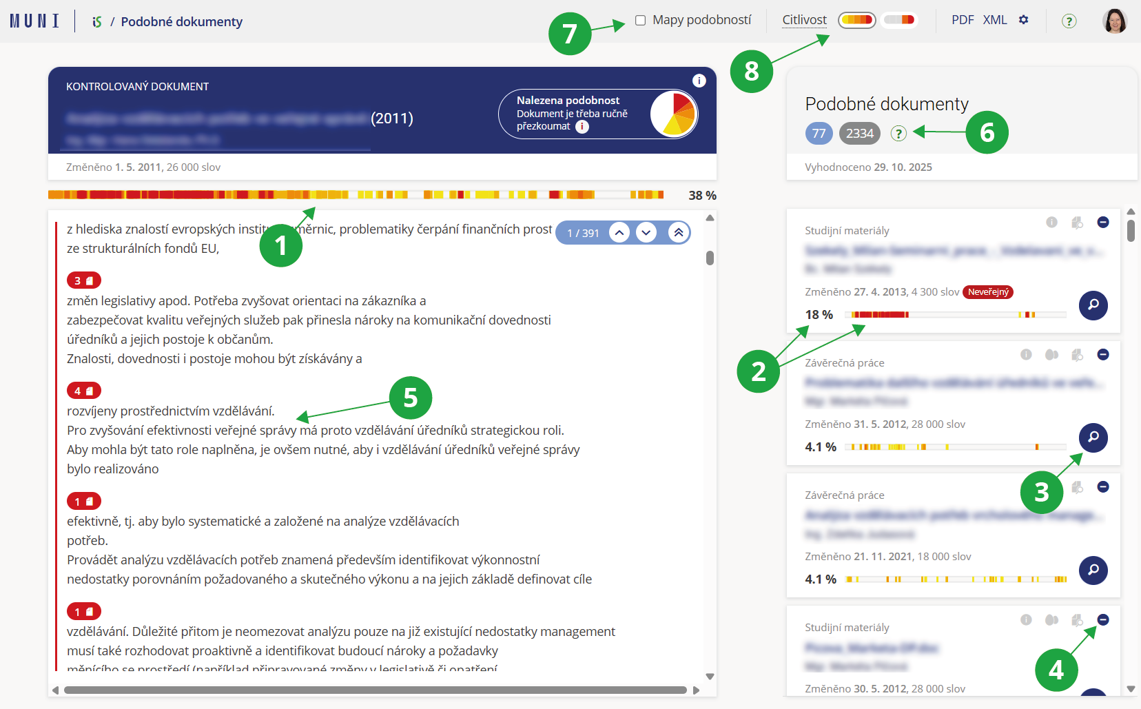 3 Barevné tečky ukazují podobné pasáže obou dokumentů, barva značí míru podobnosti. Kliknutím na barevnou tečku zvýrazníme příslušné pasáže v obou dokumentech.